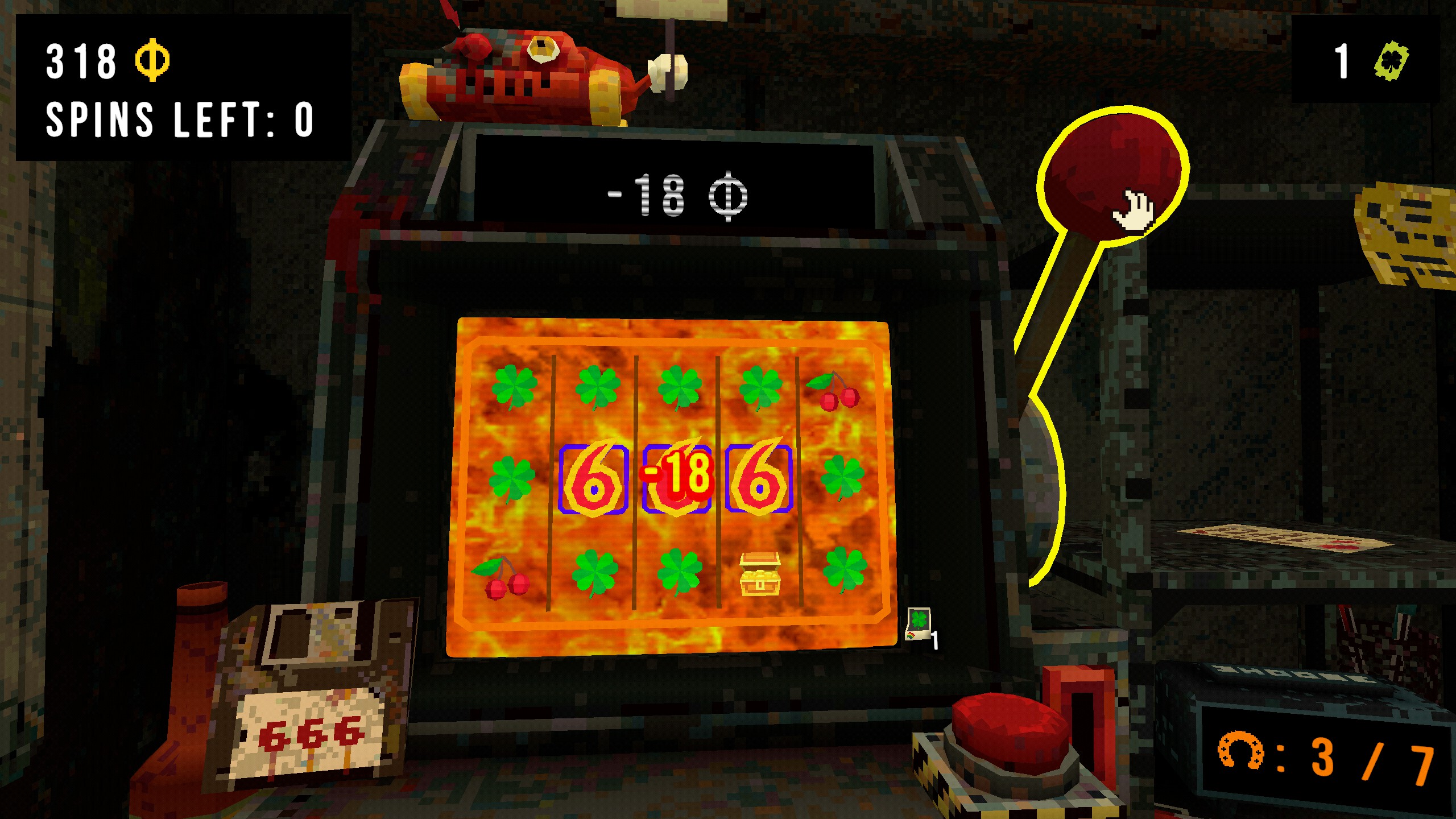 No, mitä tämä demoninen numeeri oikein tarkoittaa pelissä? Jos ja varsinkin KUN pirun numerot napsahtavat kohdilleen, menettää pelaaja sen kierroksen aikana tienatut kolikot. Ja tämä tapahtuu perkele jokaisella pelikerralla ainakin kymmenen kertaa. Syö vähän ideaa koko hommasta, sillä samaan aikaan onnenkaluilla olet voinut saada kirsikoiden esiintymisprosenttiin yli 60 ja kirsikoita tulee vain muutama, mutta puolentoista pinnan 666 tulee sitäkin enemmän.