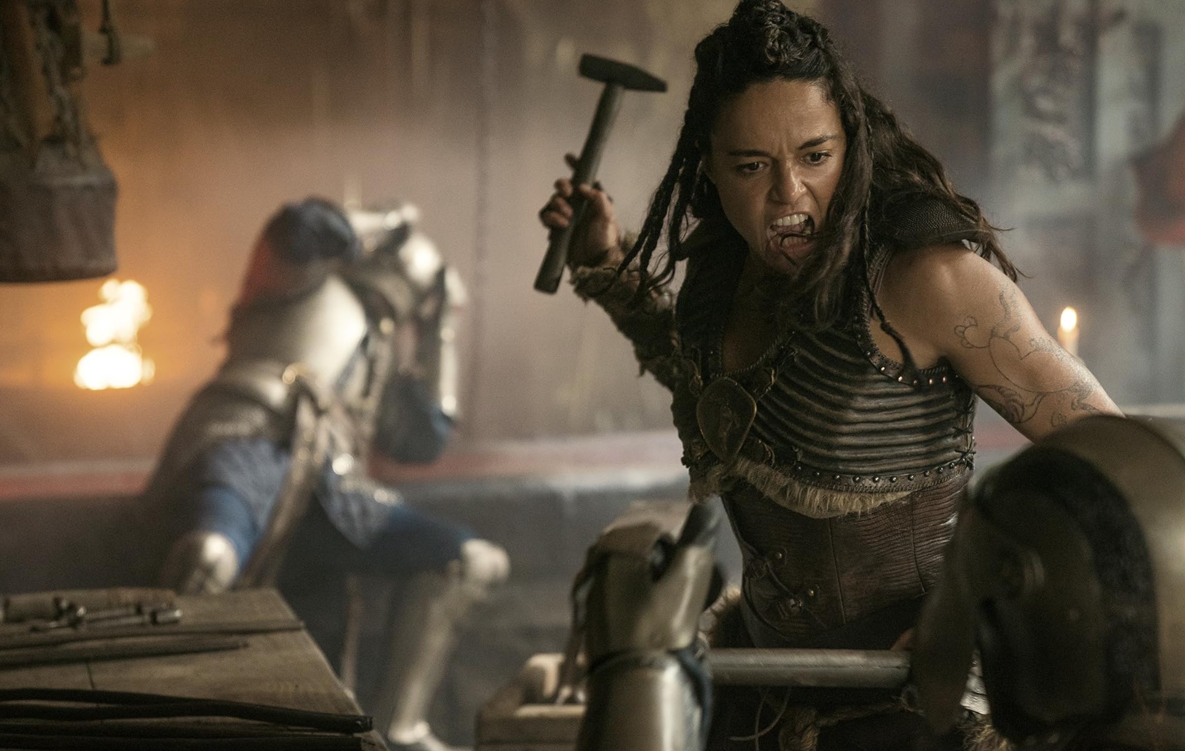 Toinen poikkeus on Dungeons & Dragons: Honor Among Thieves (2023). Hahmo Holga on edelleen fyysisesti vahva, mutta elokuvan sävy on kevyempi ja itseironinen. Rodriguez jopa parodioi omaa kovanaisen imagoaan, antaen sen näyttäytyä hauskana ja inhimillisenä.