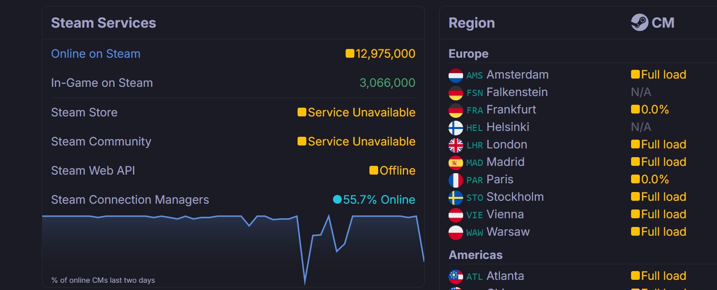 Steamstat-palvelun tietojen perusteella palvelimet olivat aiemmin täydessä kuormituksessa, mikä viittasi mahdolliseen palvelunestohyökkäykseen. Nyt palvelut näyttävät kuitenkin toimivan normaalisti.