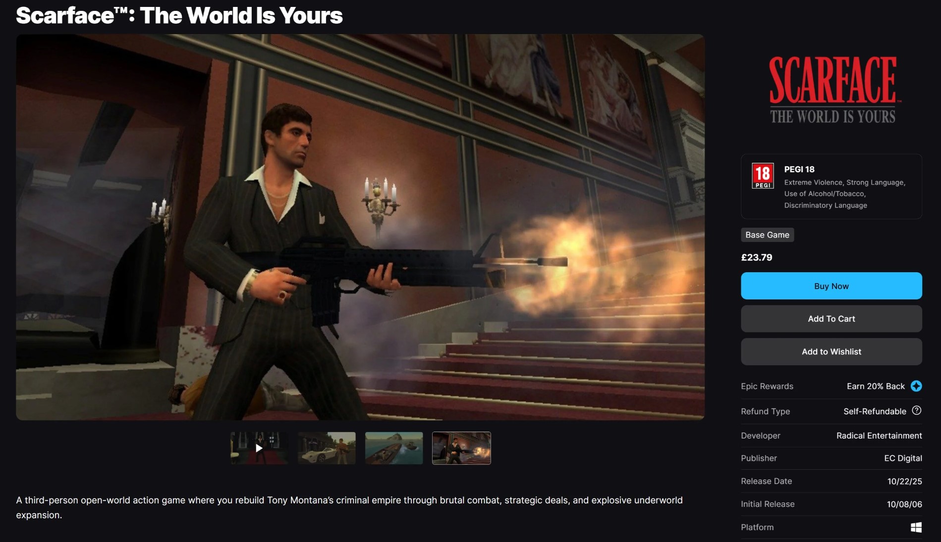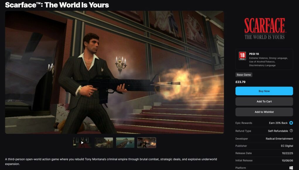 HD-remaster-versio pelistä Scarface: The World is Yours ilmestyi yllättäen Epic Games Storeen, mikä herätti epäilyksiä julkaisun laillisuudesta.
