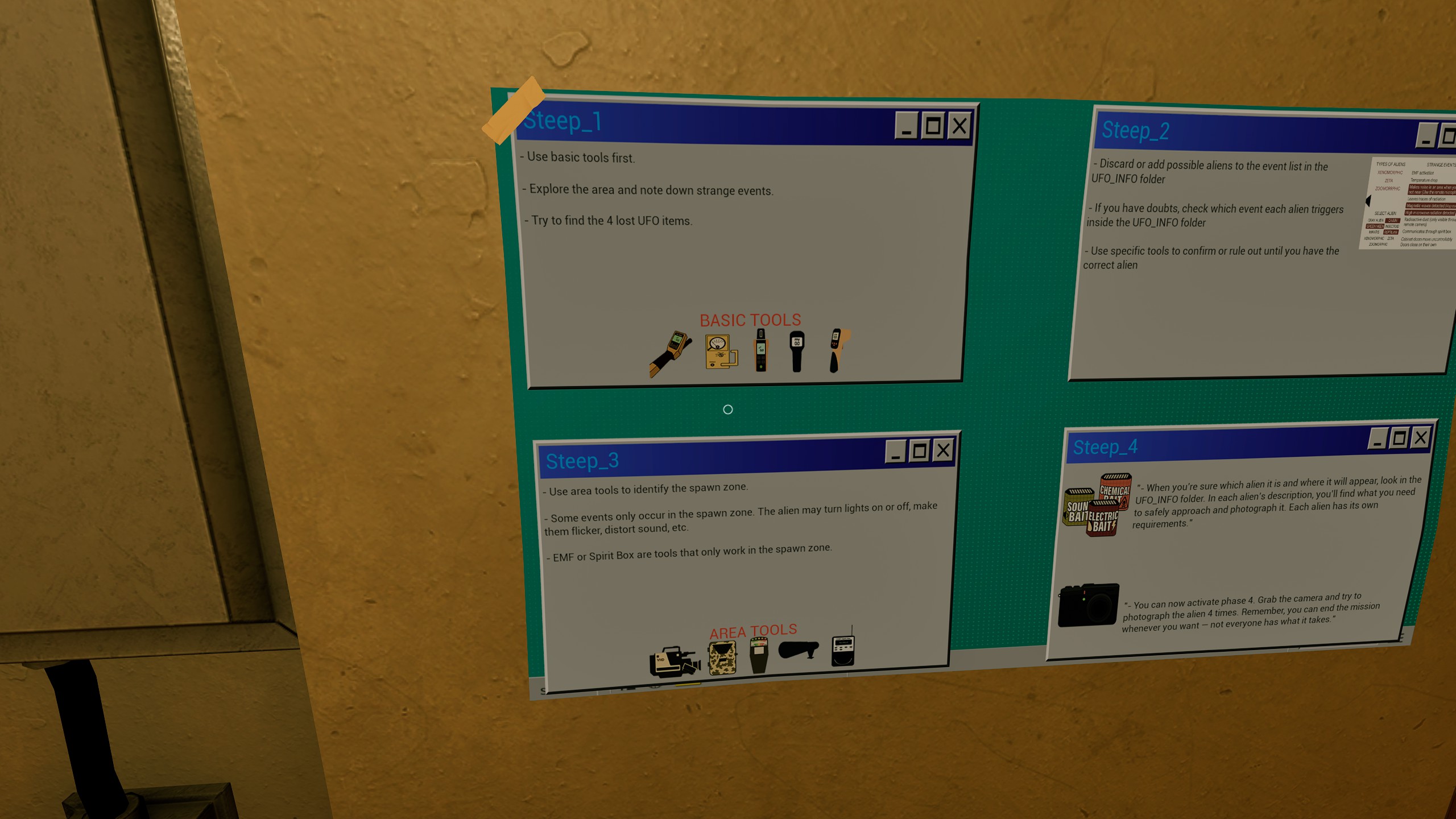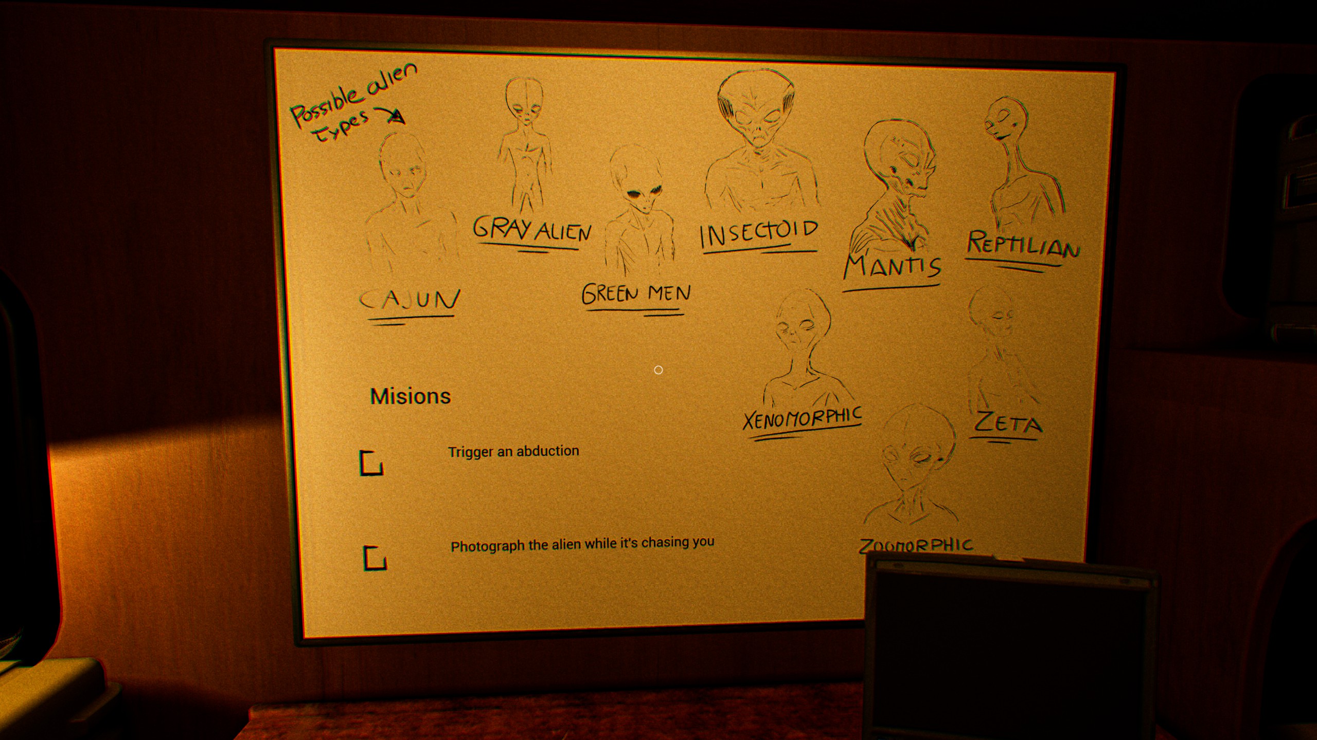 Phasmophobian tyyliin on tarkoitus kerätä todistusaineistoa kohteessa olevasta – tai olevista avaruuden vierailijoista. Phasmoa pelanneet ovat kotona välittömästi, vaikka peli nojaakin enemmän Demonologist-peliin. Sama konsepti ja samat Unreal 5 -moottorin aineistot (assets). Demonologist-peliä pelanneet huomaavat, että ensimmäinen kohde on täsmälleen sama talo, irtaimistoineen ja huonekaluineen. Ihanan löysäperäistä!